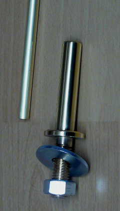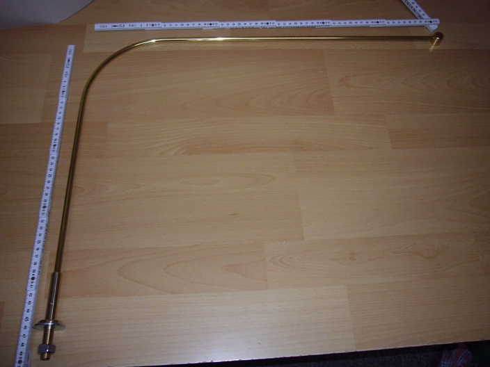 Rosette: Aus Messing gefertigt mit Gewindeschaft D=12 mm zur Befestigung mittels beigefügter Mutter. Aufnahmeschaft für das Halteröhrchen mit Außendurchmesser 13 mm und Minimadenschraube zur Fixierung des eingesteckten Halteröhrchens. Sichtbare Länge nach Einbau 65 mm.