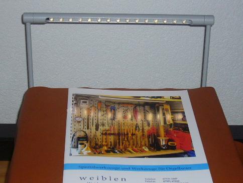 Stromversorgung durch mitgeliefertes Stecker-Netzgerätes für 100 - 230 V Lichtstrom. Soll die Beleuchtung schaltbar sein, muß am Pultgehäuse oder an anderer geeigneter Stelle ein Schalter für die Stechdose angebracht werden. Falls eine Helligkeitsregelung gewünscht ist, kann in das Schwachstromkabel ein Dreh-Dimmer zwischengesteckt werden.
