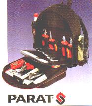 Parat tool backpack at a special price! An interesting alternative, the Back-Pack from Parat! Ideal for service work on elevators, on scaffolds, roofs etc., everywhere where you need to have both hands free to climb. Size approx. 320 x 170 x 425 mm, weight approx. 1900 g, black and grey coated nylon fabric reinforced by plastic frame and with padded back panel for carrying comfort. Fold-down front with large interior compartment with 16 slip pockets, 5 rubber loops and 2 clip pockets for documents. Exterior patch small parts compartment with pockets for business cards, pens, etc.
