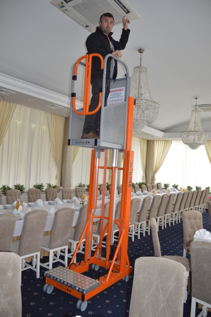 Ideales Gerät für Montage- und Reparaturarbeiten in der Höhe mit sicherer Standfläche. Überall dort schnell einsetzbar, wo sonst umständlich Fahrgerüste aufgestellt werden müßten oder man sich mit Bockleitern behelfen müßte.
