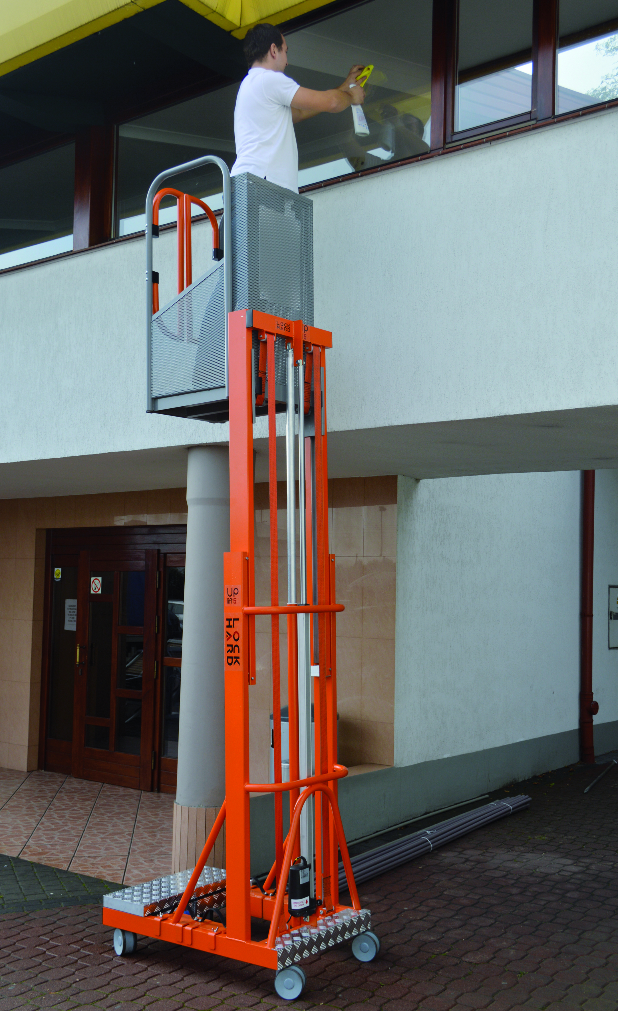 Hubgeschwindigkeit 10 m/min = Fahrzeit auf volle Arbeitshöhe nur ca. 20 sec. Durch Batteriebetrieb hohe Flexibilität. Weiter ausgestattet mit Auf- und Abtaster von der Arbeitsplattform aus bedienbar. Zus. Schlüsselschalter, damit keine unberechtigte Benutzung möglich ist. Notaus-Schalter und automatisch arretierende "Türen" erhöhen die Sicherheit.