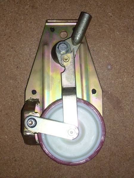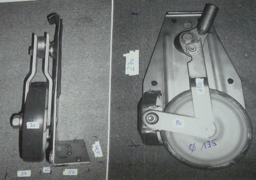 Die Räder mit Polyurethanbereifung mit Durchmesser 138 mm und 28 mm Breite sind über einen Hebemechanismus mit dem gelb verzinkten Stahlblechgestell verbunden. Die Anlagefläche ist zum Schutz des Transportguts mit einem Gummibelag versehen.