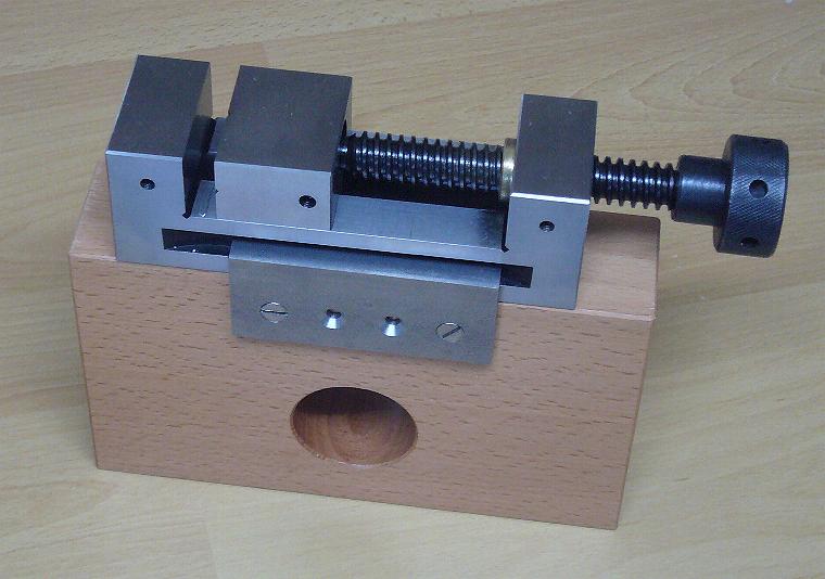 Auf einem Buche-Massivklotz mit zus. Loch zur Befestigung mittels Schraubszwinge, wurde der Präz.-Schraubstock aus geschliffenem Stahl montiert. Ideal zur Befestigung auf einem Werktisch durch die Zunahme der Arbeitshöhe um 15 cm, aber auch ideal zum Einspannen in die Hinterzange von Hobelbänken. Weiter kann dieser Schraubstock den früher von ULMIA angebotenen Spannstock zur Bearbeitung von dünnen Leisten ersetzten. Dazu wird der Schraubstock mit seinen außenliegenden Befestigungsflächen so tief in die Hinterzange eingespannt, daß die Schraubstockbacken nur wenig über die Hobelbankfläche überstehen. Die Backen halten dann die dünnen Leisten und können auf Zug gut mit dem Hobel bearbeitet werden.