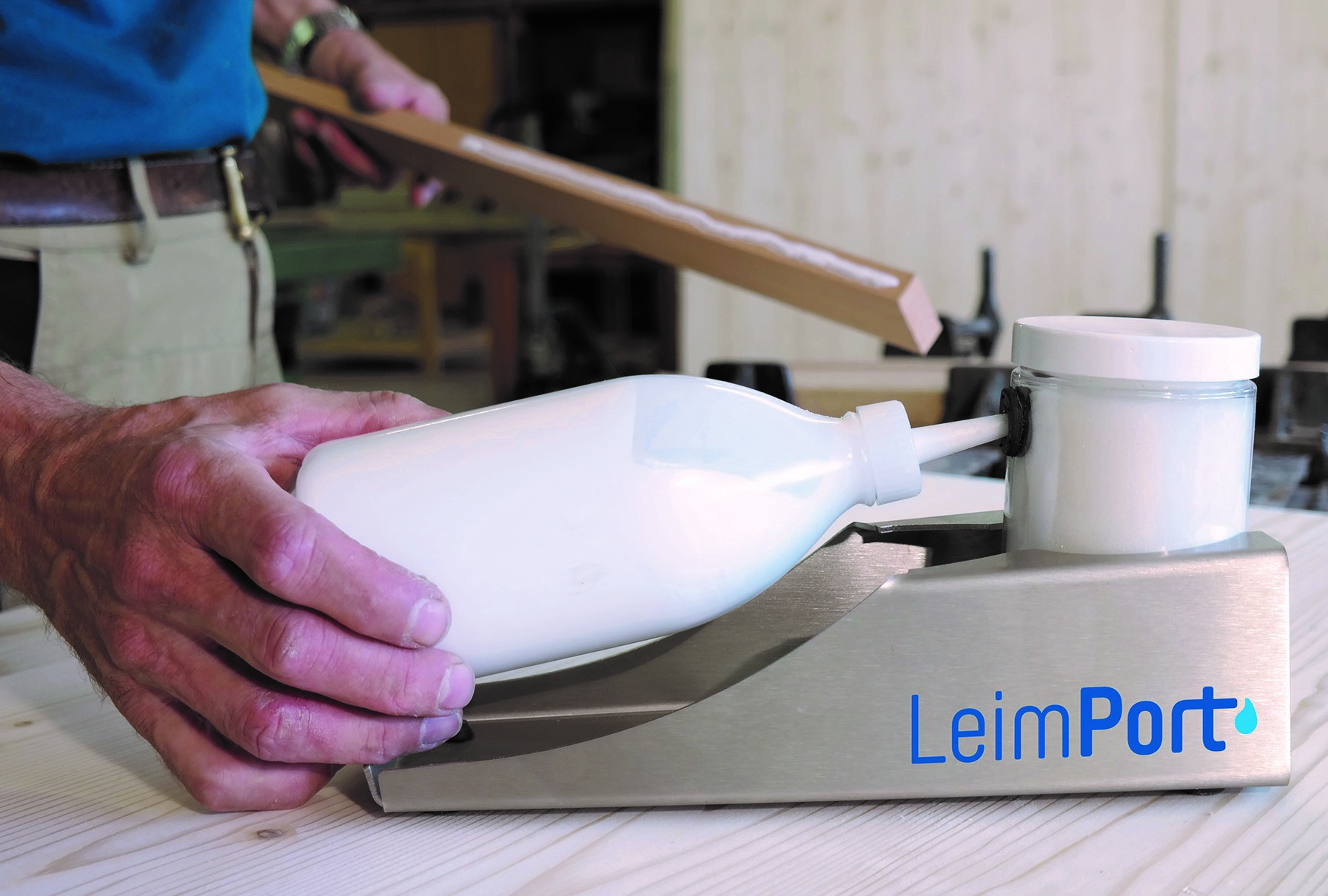 Effizentes Leimen mit der Leimflasche war das Ziel von Entwickler Schreinermeister Schindler. Mit dem LeimPort ist das auf einfache Weise möglich. Die Leimflasche wird im Aufbewahrungsständer "aktiv" gehalten. Kein Antrocknen der Düse und durch die liegende Ruheposition ist die Leimflasche sofort einsatzbereit.