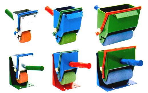Standardmäßig liefern wir die Pfohl-Leimer mit Schwammgummiwalze. Die Größen mit Walzenbreite bis 150 mm werden mit einem Druckguß-Leimbehälter geliefert, die Breite 200 mm mit einem stabilen Kunststoffleimbehälter.