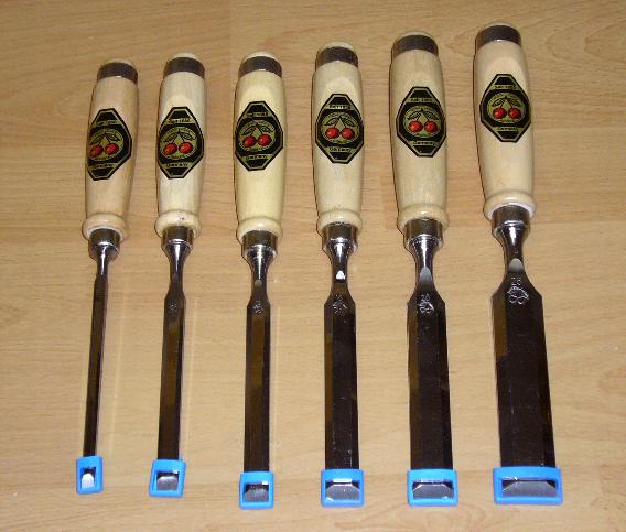 6 Stück hochwertige Kirschen Stechbeitel in den Breiten 6, 10, 12, 16, 20, 26 mm. Die Stechbeitel sind gebrauchsfertig geschliffen.
