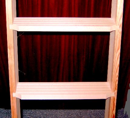 Holme 85 x mind. 20 mm aus in der Länge verleimtem Nadelholz, Stufen flach 85 x 18 mm aus massiver Buche mit Trittrillen. Außenbreite der Leiter 40 cm. Tritthöhe ca. 23 cm. Der Anstellwinkel beträgt ca. 70 Grad. Max. Trittbelastung 100 kg. Gewicht ca 1 kg pro Stufenanzahl.