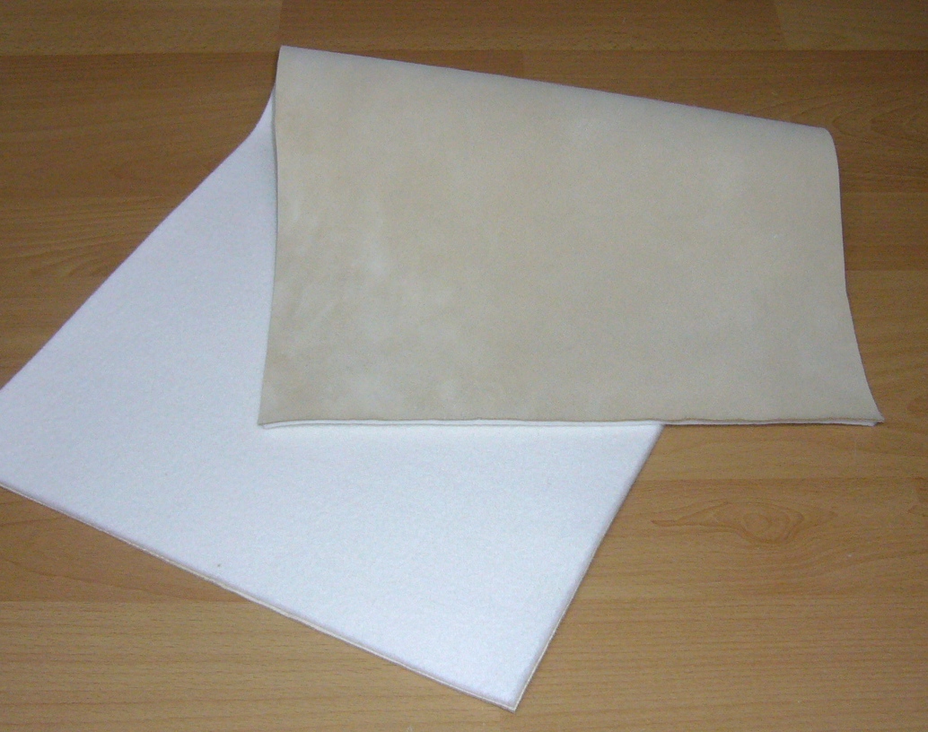 Belagsplatten 600 x 300 mm aus weißem weichen Wollfilz in den Stärken 2 oder 3 mm mittels hochwertiger Selbstklebefolie mit mittlerem Gasometerleder (unsere Kat. Nr. B7160) verklebt.