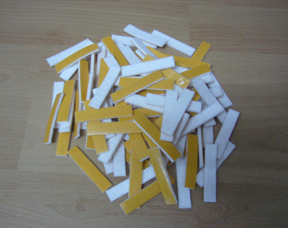 Längliche Filzpads aus mittelhartem ca. 3mm starkem weißen Filz, einseitig mit Selbstklebefolie belegt und mit Schutzpapier abgedeckt.