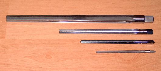 Schwach konische HSS-Reibahle für das präzise Einpassen von Mechanikachsen. Die Bestelldurchmesser sind die kleinsten Bohrungsdurchmesser, die mit der Reibahle noch gut gerieben werden können, z.B. D=6mm entspricht Reibahle vorne 5,8 und hinten 7,0 mm.