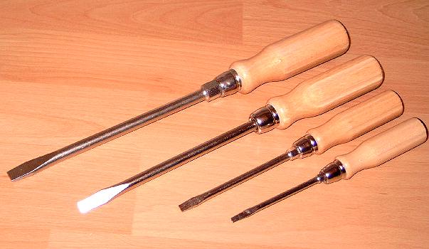 4tlg. Schlitzschraubendrehersatz mit lackiertem Holzheft. Klingen vernickelt, teilweise mit Schlagknopf.