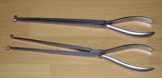 Diese Spezialzange aus Edelstahl mit extrem langem Schnabel hat spezielle Haken an der Spitze zum Anpacken von Draht-Schenkelfeldern.