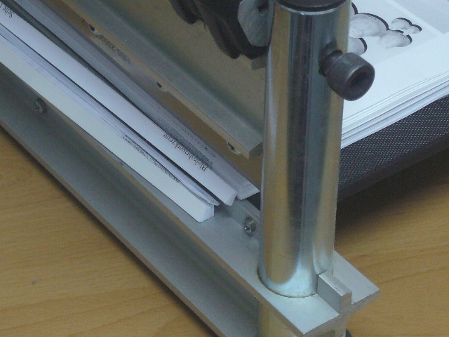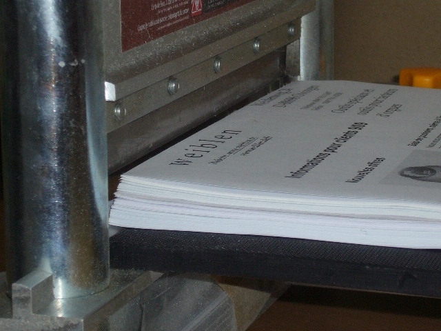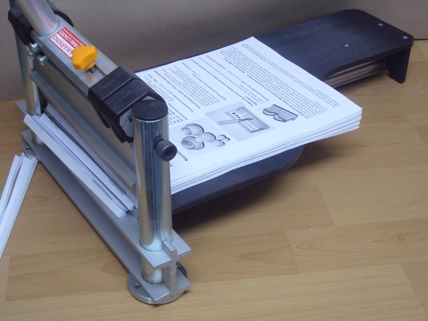 Gegenüber üblichen Schwert-Papierschneidern arbeitet dieses Gerät mit einem parallel sich senkenden Messer über die ganze Schnittbreite von 320 mm. Das Schneidgut und damit auch ein Papierstapel mit der max. Schnitthöhe von 15 mm bleibt beim Schneiden ohne Verrutschen liegen. Damit sind Abschnitte von nur wenigen Millimetern an ganzen Papierstapeln möglich, wie auch Papierstapelzuschnitte exakt nach Ihren Vorgaben.