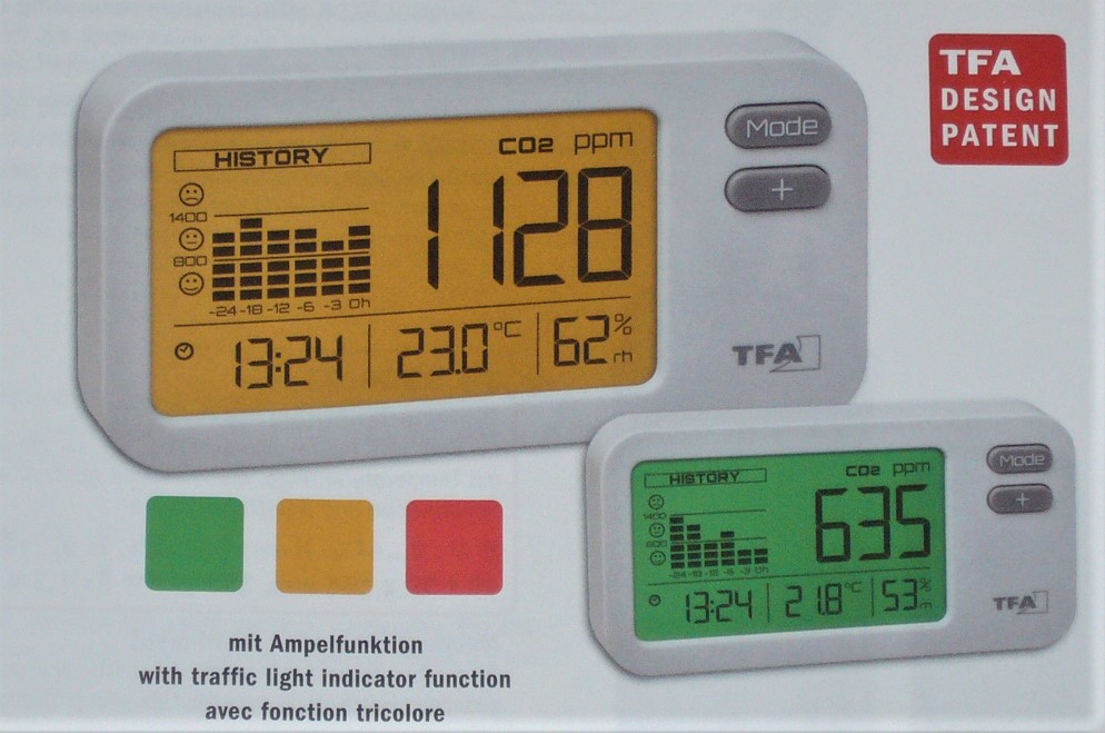 Das Gerät misst regelmäßig neben der Lufttemperatur und der rel. Luftfeuchte den CO2-Wert in ppm. Dieser ist entscheidend für die Konzentrationsfähigkeit und das Wohlbefinden und in Zeiten von Corona besonders wichtig bzgl. des nötigen Luftaustausches zur Verringerung der Virenbelastung.