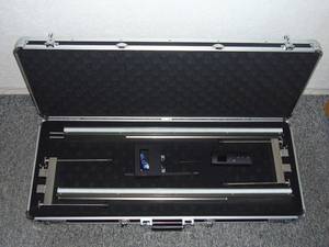 Durch die geteilte Fahrschiene passt alles in einen handlichen Koffer mit nur 84 cm Länge. Der befüllte Koffer wiegt 13,6 kg, wobei das Gewicht der Fahrschiene und die Aufstellfüße bewußt schwer gewählt wurden, damit der Gegendruck zu den Pedaltasten vorhanden ist.