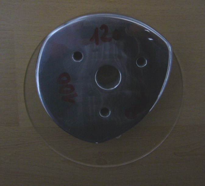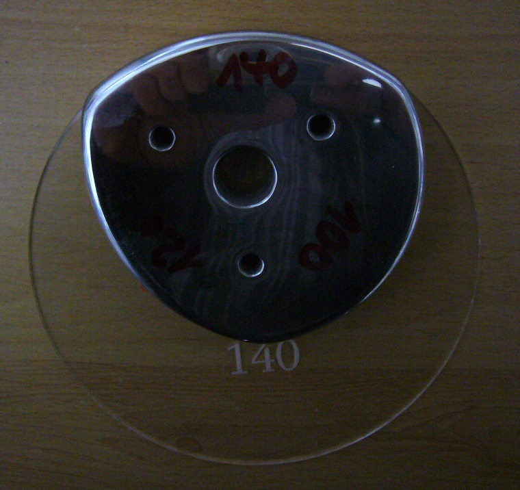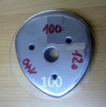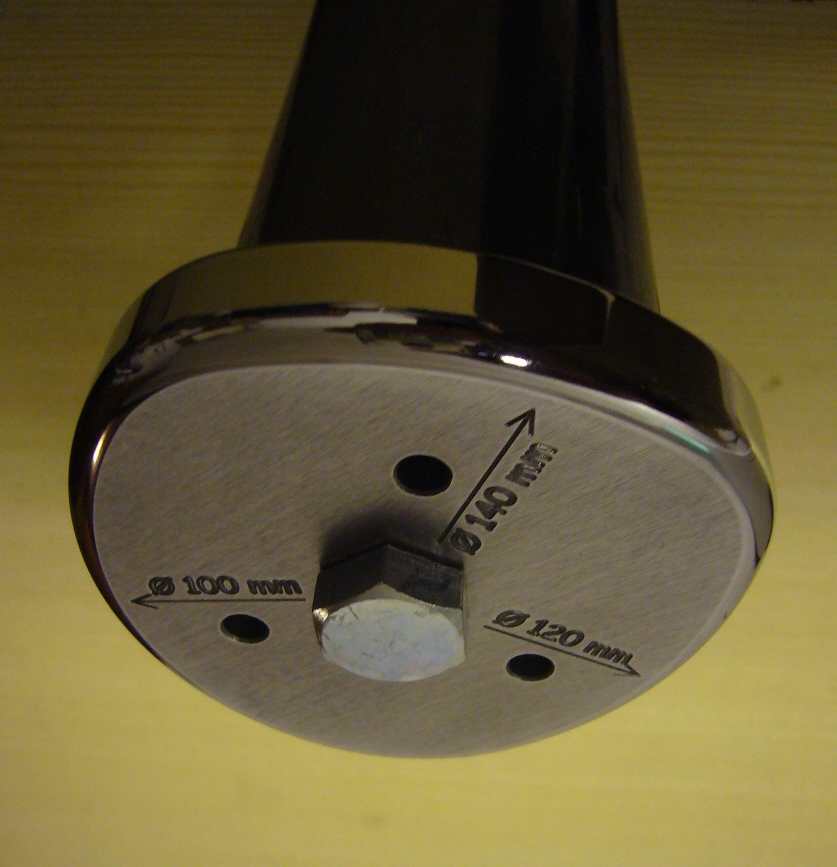Die Ausbeulscheibe aus 20 mm dickem Stahl und polierten Kanten haben wir für 3 Durchmessergrößen vorgesehen. Die Aufnahmestange mit max. 70 mm Durchmesser, die auch gestückelt aus versch. Durchmessern bestehen kann, wird waagerecht frei eingespannt und die Scheibe nach gewünschten Durchmesser nach oben zeigend an dieser mittels der vorhandenen 16 mm Zentrumsbohrung für M-16 oder entsprechender Holzschraube befestigt. Die 3 weiteren Bohrungen mit 6 mm sind für eine provisorische Befestigung z. B. an einer evtl. auch eckigen Holzstange gedacht. In der Anwendung wird der zyl. Pfeifenkörper mit mind. 100 mm Innendurchmesser über den polierten Rand der Scheibe bis zur Delle geschoben. Dort wirkt die Scheibe wie ein innenliegender Polierstahl mit dem drückend und ziehend die Delle ausgeformt werden kann.