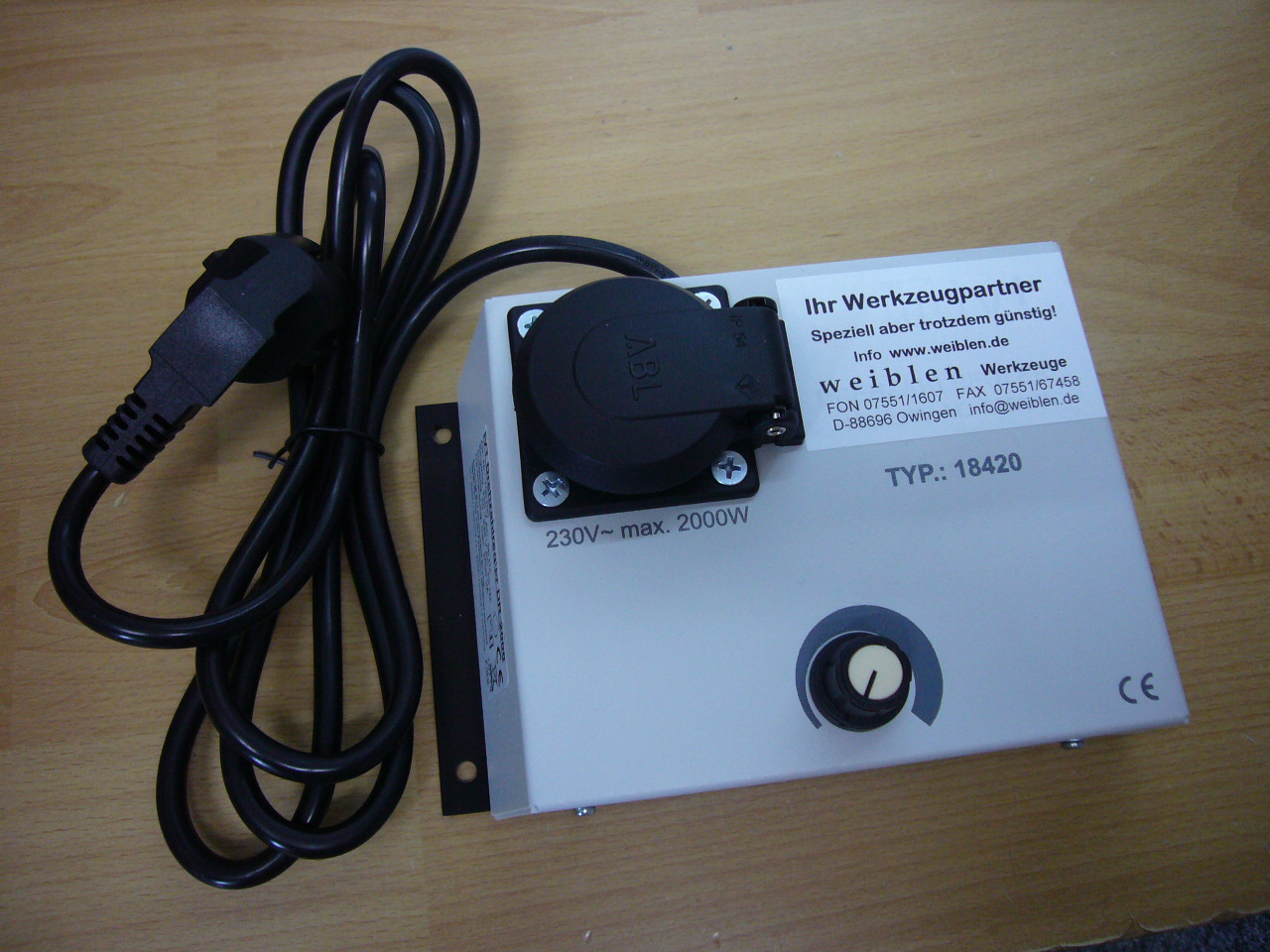 Wechselspannungssteller für Verbraucher bis 2000 Watt in Metallgehäuse, Schutzkontaktsteckdose, Regelknopf, Feinsicherung innen, Anschlußkabel für 230 V, Regelknopf 0 - 250 V Phasenanschnitt zum frei Aufstellen oder Aufschrauben auf eine Platte. Eingangsspannung 100 - 250 V AC (Anschlußkabel nur für 230 V EU-Steckdosen). Nur für trockene Räume geeignet!