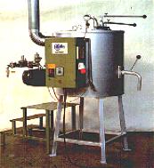 Stabile Stahlkonstruktion mit wärmeisoliertem Kessel und handbetätigtem Rührwerk. Stahltreppe zur Beschickung und Abzugshaube lieferbar.