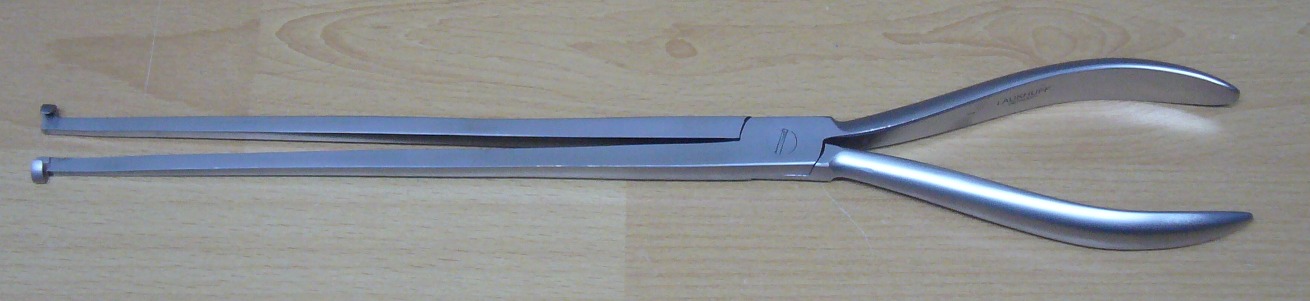 Spezialzange von Laukhuff zum Aus- und Einbau von Schenkelfedern an Windladenschwanzventilen.