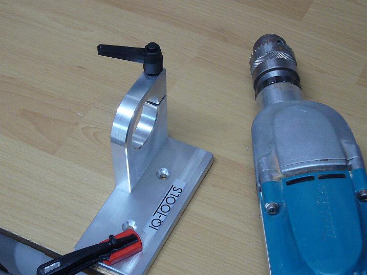Die Aufnahme selbst ist aus Aluminium gefertigt mit Grundplatte 140 x 60 mm zum Aufschrauben mittels 2 Löchern oder für eine Schnellbefestigung mittels Schraubzwinge. Die Aufnahme besteht aus dem geschlitzten Aufnahmeloch mit Durchmesser 43 mm und wird mit dem kleinen Klemmhebel kraftschlüssig auf die Bohrmaschinenaufnahme gedrückt.