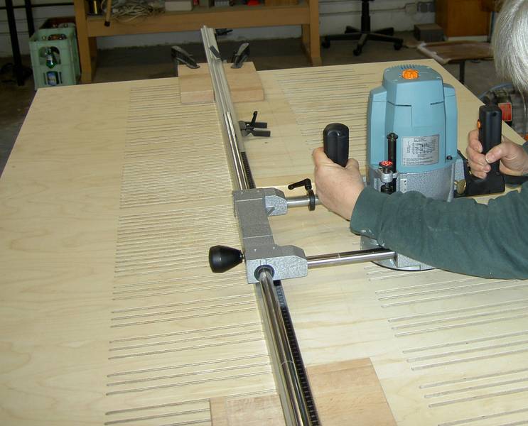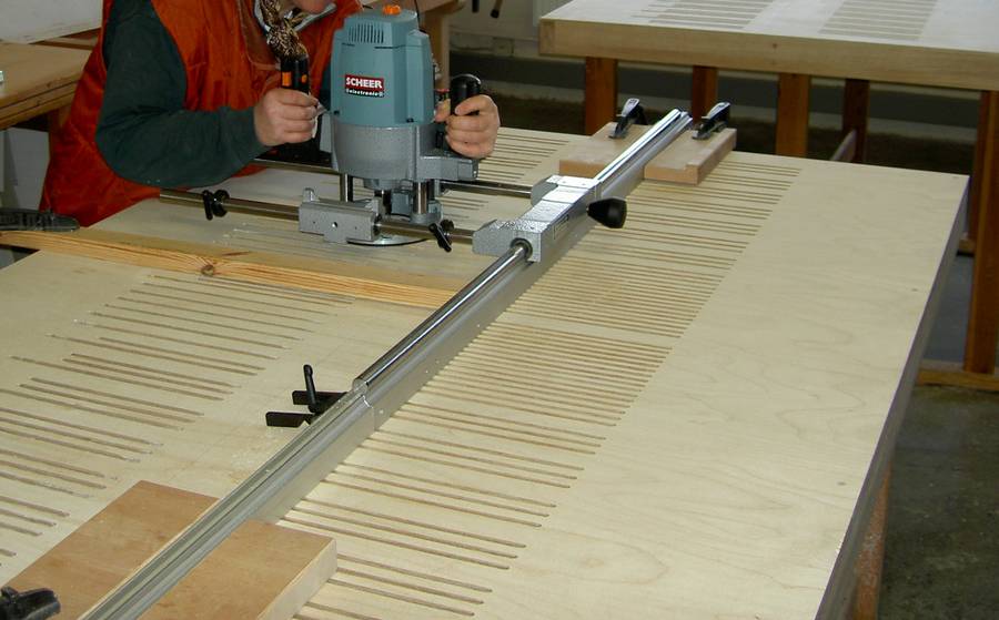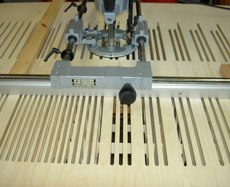 Die Führungsschiene für den Fräsenwagen ermöglicht 900 mm Verfahrweg. Der angedockte Frässchlitten für die Oberfräse hat 380 mm Verfahrweg. Durch die beiden Ausleger kann die Vorrichtung an jeder Stelle des Windladenkorpusses fixiert werden.