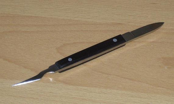 130 mm langes Werkzeug mit Griffschalen und einseitiger 3kant-Spitze 20 mm lang mit Rückenbreite von 0 - 1,5 mm ansteigend.